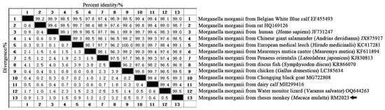 Comparison of similarity between M. morganii of rhesus monkey (Macaca mulatta) (RM2023) and other M. morganii.