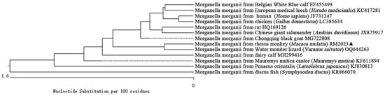 Phylogenetic tree of 16S rRNA sequences between M. morganii of rhesus monkey (Macaca mulatta) (RM2023) and other reported M. morganii. “▲” is the isolated bacteria strain from the rhesus monkey in this case.