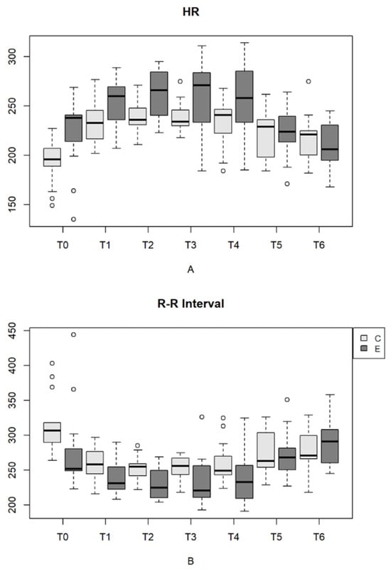(A)—HR variation (bpm) in newborn dogs at each type of delivery and time point. (B)—R-R interval (ms) in newborn dogs at each type of delivery and time point. Parturition E (eutocic); Parturition C (emergency cesarean). Outliers are represented by circles.
