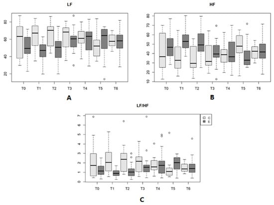 (A)—LF variation (n.u.) in newborn dogs at each type of delivery and time point. (B)—HF variation (n.u.) in newborn dogs at each type of delivery and time point. (C)—Variation in the LF/HF ratio in newborn dogs at each type of delivery and time point. Parturition E (eutocic); Part C (emergency cesarean). Outliers are represented by circles.