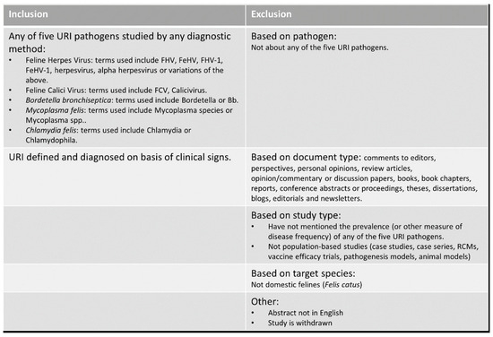 Study selection: Study selection was conducted in two phases: first, by screening the titles and abstracts of all unique articles obtained through the database searches; and second, by reading the full text of each article selected in the preceding step. For both steps, screening for inclusion was performed using pre-defined selection criteria (Figure 1). Titles and abstracts were manually screened by the main author (U.K.), and if feline URI or one or more of the five pathogens implicated in feline URI were mentioned in a population-based observational context, the article was included. Case reports, experimental animal models or studies not reporting on domestic feline species (Felis catus) were excluded. To validate the selection process, every 8th article was chosen to obtain two sets of 31 articles each. These were sent to two independent verifiers together with the pre-defined selection criteria. The results were compared for agreement or discrepancy; if articles were found to be erroneously included or excluded, these were re-categorised by consensus between the verifiers and authors.