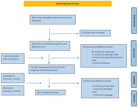 A total of 243 unique articles were identified from the four databases. After title and abstract screening, 95 articles were included for full-text evaluation. Three further articles were added from hand searches and email alerts. Eight articles were eliminated after full-text screening, leaving 90 articles for final data extraction and analysis (Figure 2). The earliest study was carried out in 1971 with an increasing number of studies over time, with most studies (n = 65/90) between 2001 and 2020. The largest number of studies were performed on animal populations in Europe (n = 39/90) (Figure 3). A majority of studies either explicitly stated or were determined by the authors (from the focus of reported results) to have prevalence reporting as one of their primary goals (n = 72/90) (Table 3). However, there was diversity in sampling and statistical methods as well as terminology used by these studies, precluding any quantitative meta-analysis or aggregation of prevalence reports from the studies included in this review (Table 4). FHV was the most frequently studied pathogen (n = 57/90), followed by FCV (n = 47/90) as shown in Table 5. The most common pair of pathogens studied together were the two viruses (Supplementary Figure S1). Since some studies looked at multiple pathogens, these numbers are different from the total number of studies. Just under half of the studies looked at a single pathogen (n = 43/90), and three studies did not conduct laboratory testing for any of the pathogens but relied on case definitions based on clinical signs (Table 6). A total of 23 out of 90 studies had some mention of the presence or extent of coinfections.