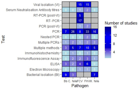 Diagnostic Methods: Understanding the variation in the performance of different diagnostic tests is another key focus of research syntheses [46]. Amongst the studies that compared diagnostic tests, many did not report the association of results with clinical signs. PCR results, especially, need to be interpreted with caution, as positive tests do not necessarily indicate active infection; routine vaccinations as well as viral shedding by latently infected yet clinically healthy animals can lead to positive PCR results [40,47,48,49], which may lead to unnecessary isolation, treatment or even euthanasia. In real-world settings, especially shelters, a presumptive diagnosis based on clinical signs can often be adequate, as there is considerable overlap of clinical signs as well as treatment options between pathogens [45]. To investigate the value of laboratory testing, further research into the association between test positivity and clinical signs is needed. While some studies did provide effect estimates that could potentially facilitate a meaningful synthesis, the heterogeneity in study design and reporting would make this challenging.