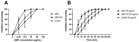 The treatment of P. aeruginosa cultures with AMPs for 24 h showed that all AMPs exerted dose-dependent inhibition of the bacterial growth (Figure 1A). Differences were found in the concentrations of P. aeruginosa inhibited by the AMPs. The bacterial growth was completely inhibited at 25 µg/mL of cBD103, whereas, for cBD and cCath, the bacterial growth was inhibited at 50 µg/mL. The bactericidal kinetics of AMPs were evaluated using the time-kill assay at the concentration of complete inhibition (Figure 1B). cBD103 completely inhibited the bacterial growth at 25 μg/mL within 60 min. In contrast, 50 μg/mL cCath and 50 μg/mL CBD took 90 min and 150 min to inhibit the bacterial growth, respectively.