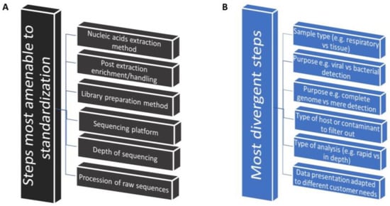 Standardization remains a significant hurdle in metagenomics. This dilemma needs to be addressed before non-targeted NGS can be widely adopted in medical and veterinary clinical practice. Recently, the challenges and prospects of clinical metagenomics in medicine were reviewed by Batool []. The authors hail metagenomics sequencing as a promising culture-independent technology. This method has no preconceived biases, making it ideal for situations where diagnosing the precise cause is challenging due to rare, uncharacterized pathogens or even co-infections. However, they recognize the need to resolve the shortcomings in terms of sensitivity, specificity, costs, standardization of bioinformatic pipelines, and interpretation of findings before NGS metagenomics can be integrated into clinical practice. The author acknowledges the potential for NGS metagenomics as a clinical diagnostic tool for identifying severe infections but emphasizes the need to conduct large-scale clinical and cross-institutional studies to validate its efficacy. Batool also highlights the impact of various factors such as sample type, quality of sampling, the platform used, number of reads generated, and data analysis tools on the sensitivity and specificity of NGS metagenomics. It was concluded that it was unlikely that metagenomics may be utilized as a first-line approach unless those issues are resolved, perhaps leaving metagenomics-NGS as a last resort for time-sensitive diagnostics in life-threatening infections.