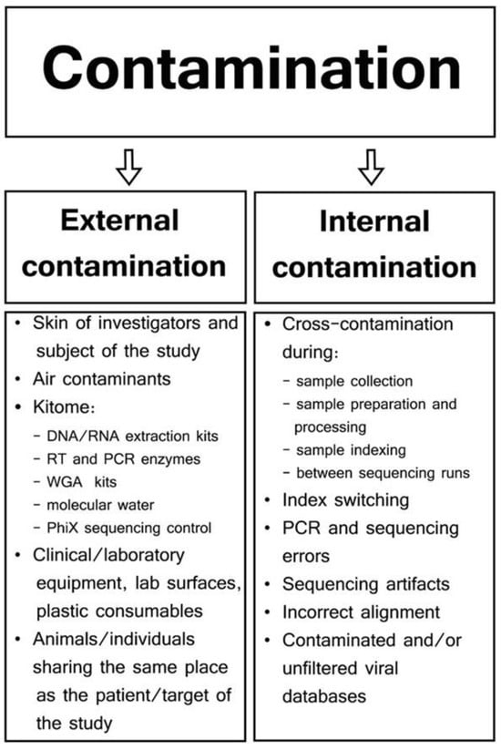 - Jurasz, H.; Pawłowski, T.; Perlejewski, K. Contamination Issue in Viral Metagenomics: Problems, Solutions, and Clinical Perspectives. Front. Microbiol. 2021, 12, 745076. [Google Scholar] [CrossRef] [PubMed]