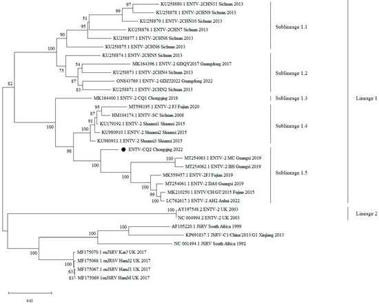 Additionally, the ENTV-2 strains from lineage 1 exhibited a certain degree of spatial and temporal clustering. In terms of temporal distribution, compared to the other four sublineages, the strains of sublineage 1.5, including CQ2, emerged slightly later in time. In terms of the spatial distribution of strains, the strains in sublineage 1.1 were primarily from Sichuan Province, those in sublineage 2 were primarily from Sichuan and Guangdong provinces, those in sublineage 1.3 were from Chongqing, those in sublineage 1.4 were primarily from Sichuan and Fujian provinces, and the newly emerged strains in sublineage 1.5 were primarily from Guangxi, Fujian, Anhui, and Chongqing, and CQ2 was closely related to the Guangxi and Fujian strains. These findings suggested that the Chinese ENTV-2 isolates exhibited a geographic clustering pattern. Furthermore, lineage 1 was composed entirely of Chinese strains, while lineage 2 was composed of strains from the UK, further indicating that the phylogeny of ENTV-2 is correlated with its geographical distribution (Figure 2).