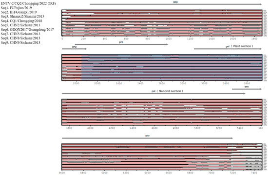 The CQ2 strain was annotated based on the annotation of other complete ENTV-2 sequences in the GenBank database. Then, the ENTV-2 CQ2 genome was aligned with those of the representative isolates FJ/Fujian/2019 (accession number: MK559457), BH/Guangxi/2019 (accession number: MT254062), Shaanxi2/Shaanxi/2015 (accession number: KU980910), CQ1/Chongqing/2018 (accession number: MK164400), CHN2/Sichuan/2013 (accession number: KU258871), GDQY2017/Guangdong/2017 (accession number: MK164396), CHN5/Sichuan/2013 (accession number: KU258874), CHN8/Sichuan/2013 (accession number: KU258877), and CHN9/Sichuan/2013 (accession number: KU258878). The comparative analysis was performed by using the mVista LAGAN genomics analysis tool (https://genome.lbl.gov/vista/index.shtml, accessed on 8 November 2023) [21,22].