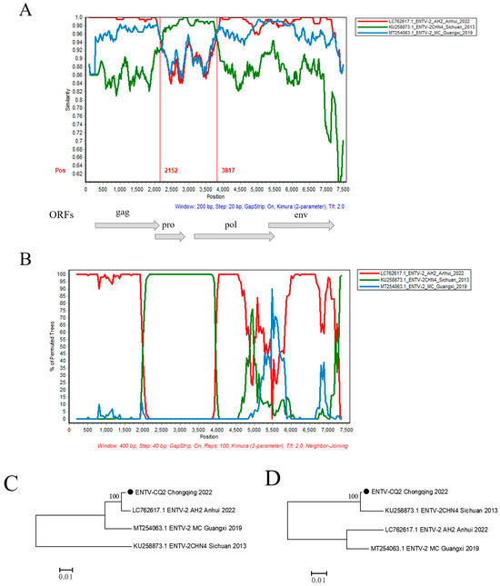 In order to further validate the possible recombination events and breakpoint positions in the ENTV-2 CQ2 strain, the full-length genomic sequences of the CQ2 strain and its 17 potential parental sequences were analyzed by RDP v4.39 and SimPlot v3.5.1 software (Table S1). The results showed that CQ2 might be a natural recombinant with CHN4/Sichuan/2013 (Sublineage 1.2) as the minor parent and AH2/Anhui/2022 (Sublineage 1.5) as the major parent. Through analysis of the similarity plot and bootscan plot performed by the SimPlot v3.5.1 software, we detected a potential recombination region on the analyzed sequence with two distinct recombination breakpoints at positions 2152 nt and 3817 nt, respectively (Figure 4A,B). In order to verify the recombination signals detected in CQ2, we conducted phylogenetic analyses of the regions separated by recombination breakpoints, including both recombinant and non-recombinant regions. The phylogenetic tree based on the non-recombinant region showed that AH2/Anhui/2022 from sublineage 1.5 and CQ2 were closely clustered on an independent branch. However, the phylogenetic tree based on the recombinant region showed that CHN4/Sichuan/2013 from Sublineage 1.2 and CQ2 were closely clustered on one relatively independent branch, which showed conflicting phylogenetic relationships compared to the phylogeny based on non-recombinant region (Figure 4C,D).