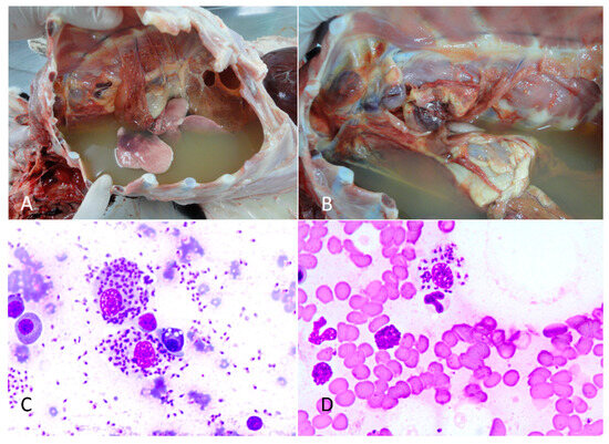 Canine Leishmaniosis associated with acute pleural effusion and sudden death in a dog. (A) Intrathoracic cavity filled with a large amount of yellowish liquid. (B) External thoracic lymph nodes showing necrosis and hemorrhage and a large amount of yellowish liquid in the chest. (C) Cytology of a pleural fluid smear revealed macrophages with intracytoplasmic Leishmania amastigotes. Rapid panoptic staining. Obj. 100×. (D) Cytology of a blood smear revealed macrophages with intracytoplasmic Leishmania amastigotes. Rapid panoptic staining. Obj. 100×.