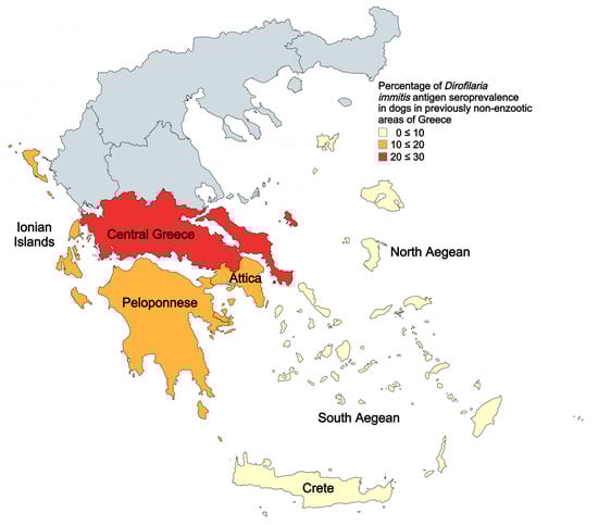 It is well established that Greece is enzootic for canine cardiopulmonary dirofilariosis, with a high prevalence of infection documented in the northern parts of the country. It should be noted that no distinct border exists dividing enzootic and non-enzootic areas. However, according to the published data originating from different parts of Greece and to the veterinary perception, regions below Thessaly and Epirus and above the northern parts of Central Greece are considered the border between enzootic and non-enzootic areas [,]. In particular, epizootiological surveys have recorded prevalence rates ranging from 6.75% up to 68% for D. immitis infection in dogs living in the northern areas of Greece, i.e., Macedonia, Thrace, Epirus, and Thessaly [,,,,,,,,]. Concerning the regions of Greece that were regarded as non-enzootic (Central Greece, Attica, Peloponnese, North Aegean, South Aegean, Crete, and the Ionian islands), the recorded prevalence rates from studies up to 2022 ranged from 0% in Crete up to 10.9% in the Ionian islands [,,,].