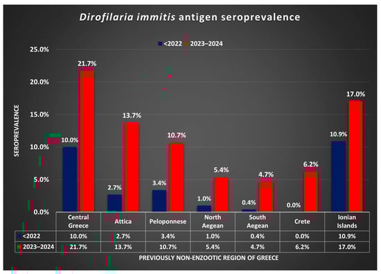 Dirofilaria immitis antigen seroprevalence before 2022 and in 2023–2024, in regions of Greece previously considered (<2022) non-enzootic.