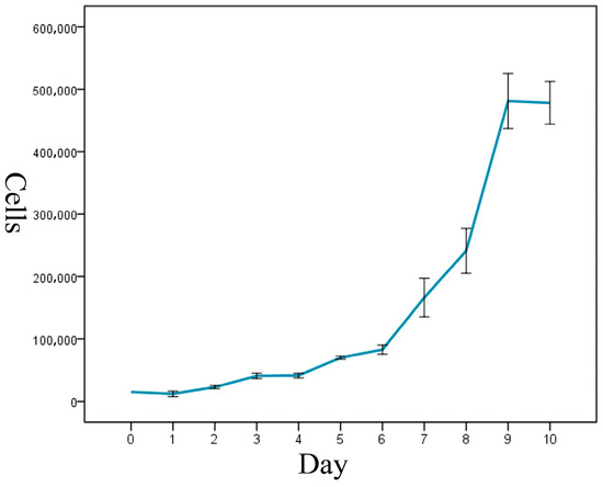 To investigate ENA-1 cell-growth kinetics, the cell suspension was diluted to 1.5 × 104 cells per mL and 1 mL of cell suspension was plated into each well of a 24-well plate. Three parallel well plates were set for each group. Cells were counted in triplicate at time intervals of 24 h for 10 consecutive days. Cell-population-doubling time was determined using the equation TD = lg2/((lgNt − lgN0)/∆t), where TD is cell-population doubling, Nt is cell number at time t, N0 is cell number at initial culture, and ∆t is the time in days.