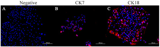 In a 12-well plate, sterilized cover slides were placed in each well. Cells were seeded in a 12-well plate with 4 × 104 cells/well and grown to 60% confluency. Cells were washed twice with PBS, fixed with 4% paraformaldehyde for 20 min, washed again, permeabilized with 0.3% Triton-X 100 for 30 min, and blocked with 3% bovine serum albumin for 30 min. Slides were incubated with primary antibodies against Cytokeratin 7 (CK7, 1:150, DF7027, Affinity Biosciences, Cincinnati, OH, USA) and Cytokeratin 18 (CK18, 1:150, AF0191, Affinity Biosciences, Cincinnati, OH, USA) diluted in blocking solution overnight at 4 °C. Primary antibodies were human-specific antibodies against a synthesized peptide of CK7 and CK18. After 3 washes in PBS, the slides were incubated with a fluorescent secondary antibody for 1 h at room temperature then washed 3 times. The slides were observed under a fluorescence microscope. PBS was used instead of the primary antibody to serve as a blank control.