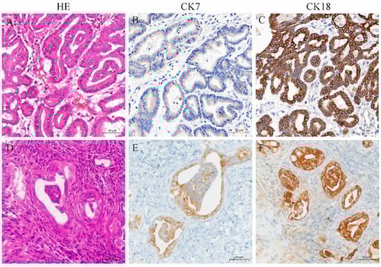Xenograft tumors from nude mice showed a tumor capsule that was composed of multiple layers of connective tissue. Tumor cells were highly differentiated, with distinct cell borders, glandular structures, and eosinophilic or neutrophilic cytoplasm stain (Figure 6D). The nuclei were round or oval, with light and uneven staining, located in the center or on one side of the cell. Mitotic figures were infrequent. Immunohistochemical results showed that the cytoplasm of the xenograft tumors expressed CK7 and CK18, with stronger expression of CK18 (Figure 6E,F).