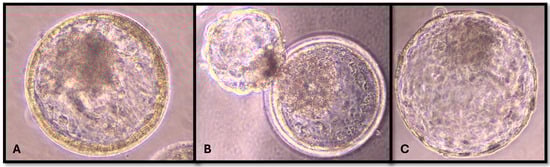 On day 8 after fertilisation, the embryos were examined by an expert in bovine embryology with an inverted microscope to determine the morphokinetic characteristics of the blastocysts and the developmental stage and quality of the embryos. This expert was blinded, as he only evaluated the embryos and was not involved in their preparation. The embryos were divided into 8 stages by kinetic classification: UFO (unfertilized oocyte/undivided embryo), 2-cell embryo, 4-cell embryo, 8–16-cell embryo, morula, blastocyst, expanding or expanded blastocyst (Figure 1), and hatching or hatched blastocyst (Figure 2). The blastocysts were classified into three grades according to Appendix 3: Consideration for evaluating in vitro-produced embryos IETS Manual 5th edition [].
