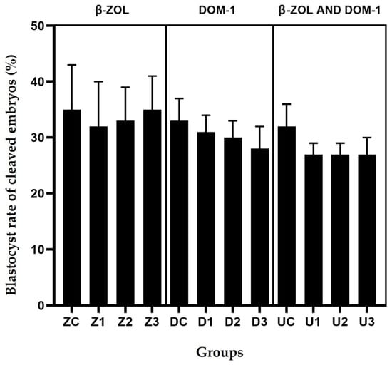 The combined experiment with β-ZOL and DOM-1 included 1558 COCs divided into four groups with sixteen replicates each. As shown in Table 2, the mean blastocyst rate of cleaved embryos was 27% in all groups U, except in the control group where it was 32% (Table 2). Despite the slight decline in the blastocyst rate shown in Figure 3, no statistical differences were observed.