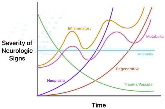 The history, signalment, and physical exam are also helpful in the prioritization of common differentials for seizures. For example, congenital and infectious abnormalities causing seizures are more likely in a young animal, whereas neoplastic or degenerative intracranial diseases are more common in geriatric patients. Another common way for clinicians to quickly remember the most common causes is the mnemonic “DAMNIT-V” [25]. The DAMNIT-V approach to differential diagnoses of seizures is seen in Figure 2 and Table 6. Figure 2 displays the onset and progression of the various differentials over time. For example, an older dog with a primary brain tumor (purple line) may have a late onset of seizure activity that gets worse over time as the tumor grows and as peri-tumoral inflammation causes further structural change. In contrast, a middle-aged dog with an acute onset of seizure activity due to an ischemic event (green line) will initially have more severe signs that will likely improve over time.