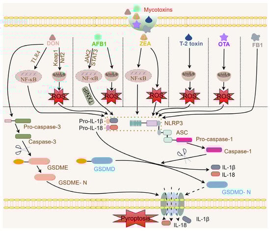 Food safety has received increasing attention, and research into the prevention and control of mycotoxin contamination has gradually become a greater focus of academic attention. Scientists have explored in depth the toxicity mechanisms of mycotoxins, which exert toxicological effects on animals through immunotoxicity, genotoxicity, OS, hepatotoxicity, cytotoxicity, teratogenicity, and neurotoxicity [18]. In vitro, mycotoxins induce programmed cell death such as apoptosis, as well as irreversible cell damage [19]. In addition, mycotoxins prevent the formation of mitochondrial complex I in cells, hindering the normal function of mitochondria and leading to increased generation of reactive oxygen species [20]. Moreover, mycotoxins have potassium-specific ionophore activity, which allows potassium ions to flow into the mitochondrial matrix and cause mitochondrial swelling [21]. Additionally, mycotoxins can bind to the 60S subunit of eukaryotic ribosomes and inhibit the production of peptide transferases [22]. Researchers have also found that mycotoxins competitively inhibit the activities of metabolic enzymes, thereby inhibiting carbohydrate and lipid metabolism [23]. Mycotoxins are structurally similar to sex hormones, affecting hormone receptors and altering hormone levels [24]. In addition, mycotoxins have a great impact on deoxyribonucleic acid (DNA) and ribonucleic acid (RNA). Aflatoxin B1 (AFB1) can indirectly inhibit the activity of RNA polymerase, thereby interfering with RNA synthesis [25]. Moreover, AFB1 undergoes irreversible covalent interactions with DNA, leading to the formation of N7–guanine adducts [26]. More importantly, a few mycotoxins can change DNA methylation levels [27]. In vivo studies have shown that mycotoxins induce different degrees of inflammatory responses and toxicological effects, resulting in organ lesions and even death in pigs, rats, chickens, mice, and other animals [28]. The diversity of mycotoxins and the complexity of toxicity mechanisms indicate that the control of mycotoxins activity is very difficult. It is crucial to investigate the toxicity of mycotoxins and elucidate their mechanisms of action to improve food safety and promote the development of animal husbandry. Numerous studies have demonstrated that NLRP3 inflammasome-mediated pyroptosis plays a critical role in mycotoxin-induced toxicity [4,5,6].