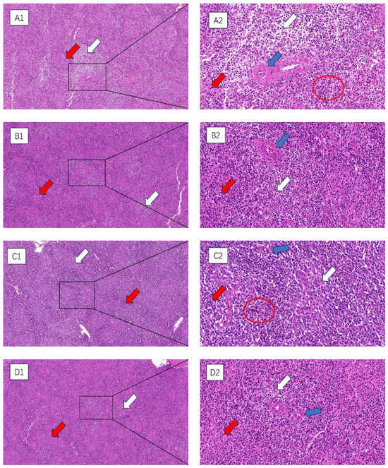 The impact of chronic HS results in histological changes in the spleen of broiler chickens. (A1–D1) 100× field of view (A2–D2) 400× field of view. White arrow: white medulla oblongata. Red arrow: red medulla oblongata. Blue arrow: central artery. Red circle: splenic hemorrhage. (A1,A2) 35-day-old HS group, (B1,B2) 35-day-old control group, (C1,C2) 42-day-old HS group, (D1,D2) 42-day-old control group.