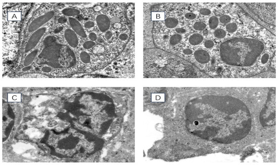 Ultrastructure of chicken spleen cells under transmission electron microscope 8000× field of view. (A) 35-day-old HS group, (B) 35-day-old control group, (C) 42-day-old HS group, (D) 42-day-old control group.