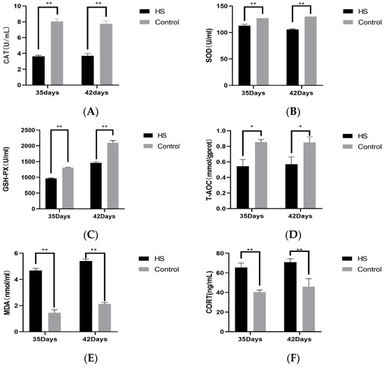 We examined the concentrations of CAT (A), SOD (B), GSH-PX (C), T-AOC (D), MDA (E), and CORT (F) in the serum of broiler chickens at 35 and 42 days of age. The results are shown in Figure 3. At 35 and 42 days of age, CAT, SOD, GSH-PX, and T-AOC in the HS group were significantly lower than those of the control group (p < 0.05). At 35 and 42 days of age, the concentrations of MDA and CORT were significantly higher in the HS group than in the control group (p < 0.01).