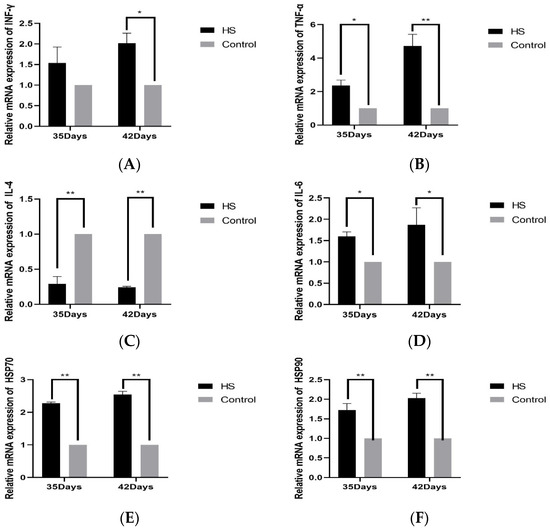 The relative expression of cytokines INF-γ (A), TNF-α (B), IL-4 (C), IL-6 (D), HSP70 (E), and HSP90 (F) in spleen tissues was detected by PCR. The results will be shown in Figure 4. The relative levels of INF-γ in the HS group at 35 days of age were not significantly varied above that of the control group (p > 0.05). The 42-day-old group was significantly higher than the control group (p < 0.05). The expression of TNF-α was considerably higher in the HS group compared to the control group at 35 and 42 days of age (p < 0.05). It was significantly higher than that of the control group at 42 days of age in HS groups (p < 0.01), the relative expression of IL-4 was significantly lower than that of the control group at 35 and 42 days of age in HS groups (p < 0.01), and the relative expression of IL-6 was significantly higher than that of the control group at 35 and 42 days of age in HS groups (p < 0.05). The relative expression of HSP70 and HSP90 was significantly higher in the HS group than in the control group at 35 and 42 days of age (p < 0.01).