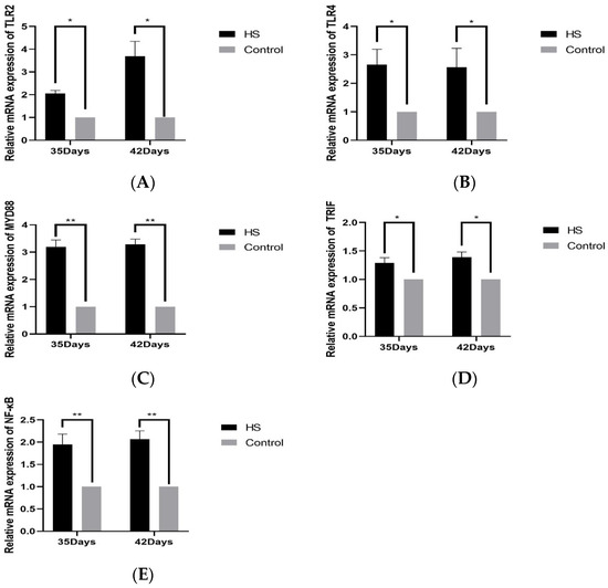 The relative expression of TLR2 (A), TLR4 (B), MYD88 (C), TRIF (D), NF-κB (E), and HSP70 (F) in spleen tissues was detected by PCR, as shown in Figure 5. The relative expression of TLR2 and TLR4 was significantly higher in the HS group than in the control group at 35 days of age and 42 days of age (p < 0.05); the relative expression of MYD88 and NF-κB was significantly higher in the HS group than the control group at 35 and 42 days of age (p < 0.01). The relative expressions of TRIF and HSP70 were significantly lower in the HS group than in the control group at 35 and 42 days of age (p < 0.05).