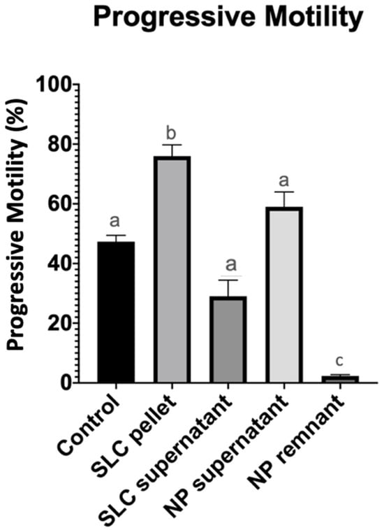 Progressive sperm motility after 20 min of incubation at 22 °C (control group), after single-layer centrifugation (SLC sperm pellet and SLC supernatant), and after nanoparticle separation (NP supernatant and NP remnant). a, b, c—statistically significant.