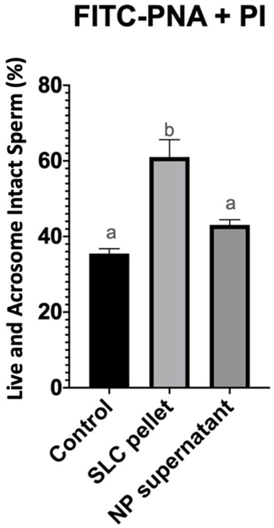 Percentage of live and acrosome intact spermatozoa after 20 min of incubation at 22 °C (control group), after single-layer centrifugation (SLC sperm pellet), and after nanoparticle separation (NP supernatant). a, b—statistically different.