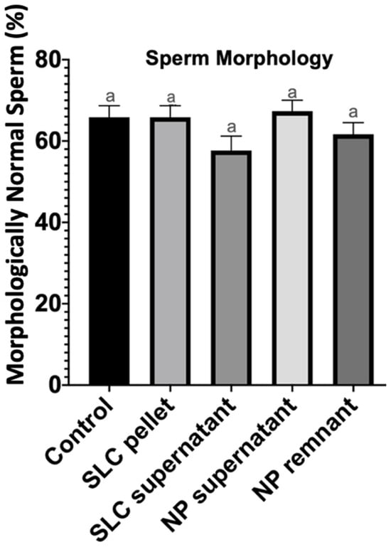 Percentage of morphologically normal spermatozoa after 20 min of incubation at 22 °C (control group), after single-layer centrifugation (SLC sperm pellet and SLC supernatant), and after nanoparticle separation (NP supernatant and NP remnant). a—no statistical differences between columns.