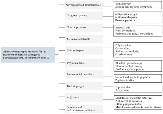 Summary of the alternative strategies proposed for the treatment of dermato-pathogenic Staphylococcus spp. in companion animals.