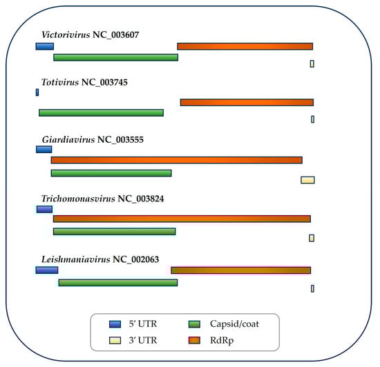 Genomic organization of the five genera of Totiviridae. GenBank accession number of the type species is shown in each genus. ORF1 is shown in green. ORF2 is shown in red. UTR, untranslated region. RdRp, RNA-dependent RNA polymerase. This review focuses on the three genera that infect flagellated protozoans.