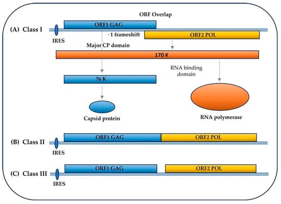 Each viral particle also contains 1–2 copies of a viral polymerase [,]. RNA has a dual function, as mRNA and as a replicative intermediary []. Single-stranded RNA (ssRNA) spans the entire length of the positive genomic strand, lacks a 5′ cap, and is not polyadenylated. The positive strand has two large open reading frames (ORFs), preceded by an internal ribosomal entry site (IRES) in the untranslated region (UTR) at the 5′ end (Figure 1) where translation is initiated []. ORF1 encodes the capsid protein (GAG, gp2, and CP) with a predicted size of 76–81 × 103. ORF2 encodes the RNA-dependent RNA polymerase (RdRp, POL, and gp1). RdRp is the only universal “hallmark” gene of RNA viruses [].