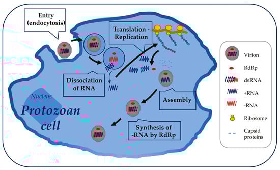Replication cycle. In the Totiviridae, viruses replicate in the cytoplasm of the host cell. For this purpose, the virion can enter the protozoan cell by an endocytosis-mediated process. Transcription of the dsRNA genome by the viral polymerase occurs inside the virion so that the dsRNA is never exposed to the cytoplasm. The dsRNA contained in the cytoplasmic vesicles is cleaved into two ssRNAs. The positive-sense RNA (+RNA) leaves the vesicle and is translated by the ribosomes, generating the capsid proteins and RdRp. These begin to assemble, and RdRp polymerizes the complementary negative-sense RNA (−RNA), both in the vesicles and in the newly formed viral particles, a process that is repeated several times, resulting in new mature virions.