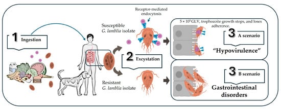 Schematic model of G. lamblia GLV+ interaction in a mammalian host. The process is initiated (1) by the ingestion of food or water contaminated with GLV-free virions and G. lamblia cysts. Once the cysts reach the small intestine, (2) excystation occurs, releasing the parasitic trophozoites. At this point, depending on the susceptibility of the G. lamblia isolate, two possible scenarios are shown. In a susceptible isolate (3A), GLV enters the trophozoite by receptor-mediated endocytosis, establishing endosymbiosis that may limit the ability of the trophozoites to adhere to the gastrointestinal epithelium and further growth. This is associated with a hypovirulent clinical phenotype of giardiosis. In a resistant isolate (3B), the trophozoite lacks GLV-binding receptors, there is no endosymbiosis, and the trophozoite adheres to intestinal cells, producing a conventional pathogenesis of giardiosis.