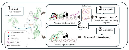 Schematic model of T. vaginalis TVV+ interaction in a human host. The trophozoites are sexually transmitted (1) and adhere to the genitourinary epithelium cells through the interaction of their surface LPG and adhesins, among other molecules, with different host ligands. The parasite triggers virulence factors that determine the clinical course of the disease (i.e., P270 and cysteine proteinases), with an increased inflammatory reaction in the presence of TVV. After the initiation of antiprotozoal treatment with metronidazole (2), two scenarios are shown depending on the presence or absence of the TVV endosymbiont. If the infection is caused by T. vaginalis TVV+ (3A), treatment with metronidazole results in the death of the protozoan and the release of virions and viral genetic material available for endocytic entry into the cells of the vaginal epithelium and interaction with TLR3 of the host endosome. This results in a hypervirulent phenotype of the disease, accompanied by its complications, which may exacerbate the clinical signs and are particularly relevant in pregnant women. However, if the infection is caused by T. vaginalis TVV− (3B), treatment with metronidazole is successful, and the disease is controlled.