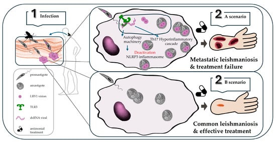 Schematic model of L. guyanensis LRV1+ interaction in a mammal host. Infectious promastigotes are released by the phlebotomine sandfly bite (1) during a blood meal and enter target phagocytic cells (macrophages). Depending on whether the promastigotes carry LRV1 or not, two possible scenarios are shown. In the case of L. guyanensis LRV1+ infection (2A), promastigotes transform into amastigotes inside the cell phagosome, and viral RNA can be released, which interacts with TLR3 inside the phagosome and triggers both the hyperinflammatory Th17 cascade (leading to metastatic lesions) and the activation of the autophagic machinery, resulting in the deactivation of the inflammasome platform, thus favoring parasitic persistence associated with treatment failure. In cases of L. guyanensis LRV1- infection (2B), the disease course progresses in a conventional manner, and disease control can be achieved with successful antimonial treatment.