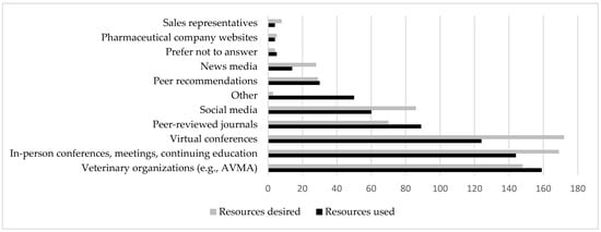 Resources used (n = 289) and desired (n = 287) by veterinarians for “One Health” information answers in response to the questions “How are you currently learning or have previously learned about ‘One Health?’ (Select up to 3)” and “What resources would be the most helpful for addressing concerns on indoor-outdoor cats and other One Health topics in practice? (Select up to 3)”.