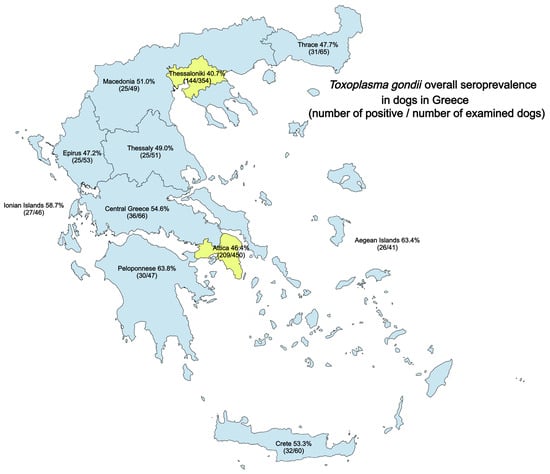 Toxoplasma gondii overall seroprevalence (IgG and/or IgM) in dogs from different geographic regions of Greece. The parentheses include the numbers of positive/numbers of examined dogs in each region. Thessaloniki and Attica represent the urban areas of the current study and are painted in a different colour.
