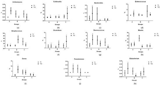 - Blake, A.B.; Guard, B.C.; Honneffer, J.B.; Lidbury, J.A.; Steiner, J.M.; Suchodolski, J.S. Altered Microbiota, Fecal Lactate, and Fecal Bile Acids in Dogs with Gastrointestinal Disease. PLoS ONE 2019, 14, e0224454. [Google Scholar] [CrossRef] [PubMed]