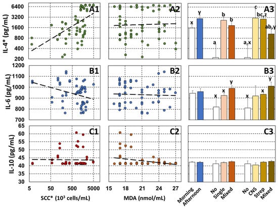 Relationship of somatic cell count (SCC) and malondialdehyde (MDA), sampling times, number of infections, and infected bacteria on interleukin-4 (IL-4), IL-6, and IL-10, respectively. (A1) Relationship of IL-4 and SCC. (A2) Relationship of IL-4 and MDA. (A3) Relationship of IL-4 and sampling times, number of infections, and infected bacteria. (B1) Relationship of IL-6 and SCC. (B2) Relationship of IL-6 and MDA. (B3) Relationship of IL-6 and sampling times, number of infections, and infected bacteria. (C1) Relationship of IL-10 and SCC. (C2) Relationship of IL-10 and MDA. (C3) Relationship of IL-10 and sampling times, number of infections, and infected bacteria. * Indicated logarithm-transformation scale for SCC and IL-4. a,b,c and x,y,z letter differences indicate significant differences at p < 0.05 and p < 0.1, respectively. No (none infection); CNS (coagulase-negative staphylococci) included S. chromogenes and S. haemolyticus; Strep (streptococcal bacteria) included S. agalactiae, S. dysgalactiae, and S. uberis. The least-square means of IL-4, IL-6, and IL-10 of the model with the specified variables were used to describe in (A3,B3,C3).