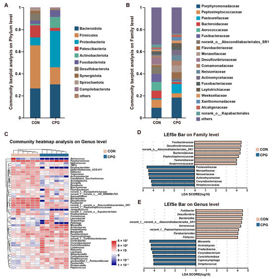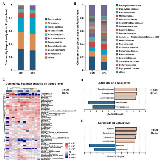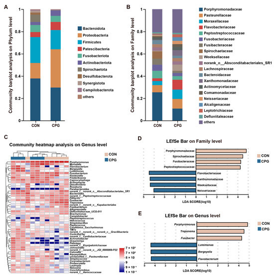 Effects of different treatments on the composition of gingival microbiota in cats on day 42. (A,B) Community barplot analysis on the phylum and family levels. (C) Community heatmap analysis on the genus level. (D,E) Linear discriminant analysis effect size (LEfSe) analysis on the family and genus levels. CON, cats fed with a basal diet; and CPG, cats received the basal diet with a post-sprayed composite probiotic formulation.