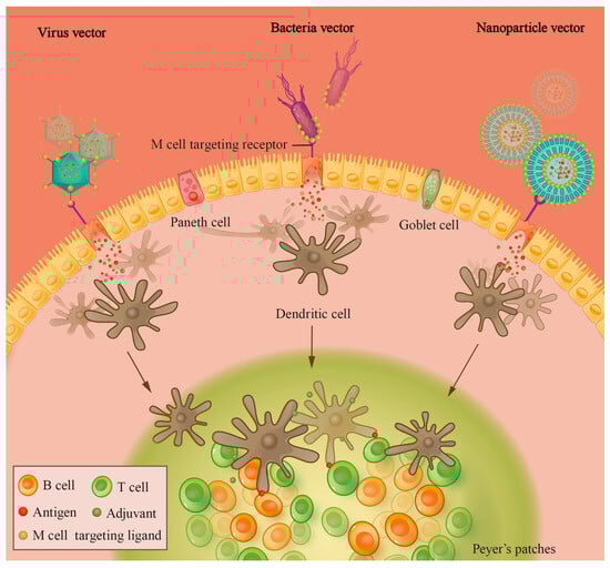 Schematic representation of the activation of the intestinal immune system by vectored oral vaccines. Viral/bacterial/nanoparticle vectors bearing targeting ligands for M cells can effectively localize and interact with M cells in the intestine, facilitating antigen endocytosis by M cells. After entering the intestinal lamina propria, antigens can be taken up by APCs such as DCs; DCs can migrate to the lymph node and induce the adaptive immune response.