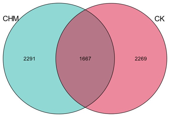 The v3-v4 regions of 16s rRNA from fecal samples of 12 cattle were sequenced by the Illumina NovaSeq sequencing platform. In total, 446,054 sequences were obtained from 12 fecal samples. After OTU clustering of sequences, 6227 OTUs were obtained. The number of OTUs shared by the CK and the CHM groups was 1667. In total, 2269 and 2291 unique OTUs were obtained from the CK and the CHM groups, respectively (Figure 1).