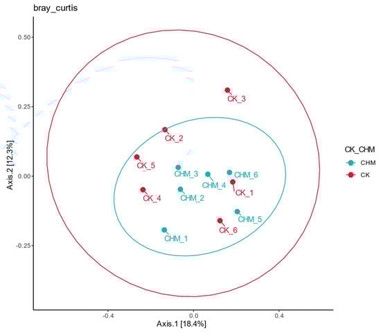 Microbial sequences of beef cattle fecal samples were subjected to PCoA analysis for Beta diversity analysis. On the 2D coordinate, Axis 1 and Axis 2 accounted for 18.4% and 12.3% of the interpretation of the results, respectively. The CK and the CHM, respectively, represent the control group and the experimental group.