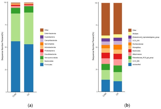 Differences in the fecal bacterial taxa in beef cattle between the CK and the CHM. (a) Phyla level taxa. (b) Genus level taxa. The CK and the CHM, respectively, represent the control group and the experimental group.