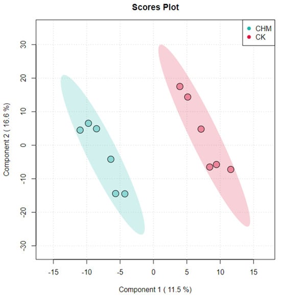 Least squares discriminant analysis (PLS−DA) score plot of fecal metabolic differences between the experimental group and the control group cattle. Hindgut fecal metabolites were separated and clustered in different regions. The CK and the CHM, respectively, represent the control group and the experimental group.