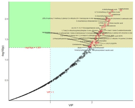 Importance map of PLS−DA metabolites in the fecal metabolome of beef cattle. The threshold was set to vip > 1 and p < 0.05, obtaining 39 different metabolites. VIP = variable importance in the projection.