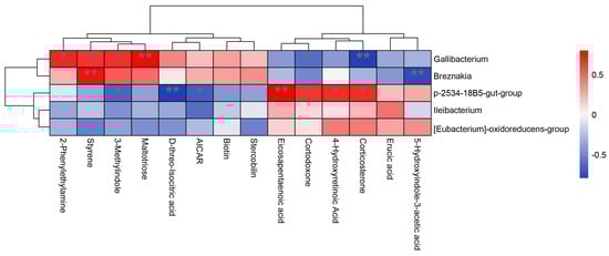 The correlation analysis between the different bacteria genera and the hindgut fecal metabolome differentials is shown in Figure 6. Positive correlations between Gallibacterium and maltotriose (p < 0.01) and styrene, 2-phenylethylamine, and 3-methylindole (p < 0.05) and a negative correlation with corticosterone (p < 0.01) and cortodoxone (p < 0.05) were found. Ileibacterium was negatively correlated with AICAR (p < 0.05). There was a positive correlation between P-2534-18B5-group and eicosapentaenoic acid (p < 0.01), 4-hydroxyretinoic acid, corticosterone, and cortodoxone (p < 0.05), and D-threo-Isocitric acid (p < 0.01) but a negative correlation with 3-methylindole and AICAR (p < 0.05). A positive correlation between Breznakia and styrene was found (p < 0.01), which was negatively correlated with 5-hydroxyindole-3-acetic acid (p < 0.01).